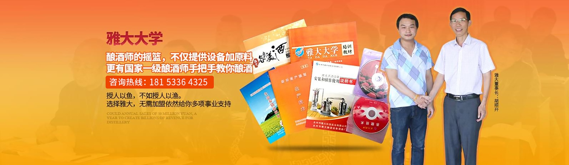 永州市雅大科技實(shí)業(yè)有限公司成立于1999年,位于湖南省南部國(guó)家歷史文化名城—永州市,是一家集釀酒技術(shù)研究、釀酒設(shè)備、釀酒酒曲生產(chǎn)銷(xiāo)售于一體的國(guó)家高新技術(shù)企業(yè)。擁有標(biāo)準(zhǔn)房、科技培訓(xùn)樓13500m7,公司連續(xù)十年被省、市江商局評(píng)為重合同守信用單位,榮獲201 7年中國(guó)釀酒設(shè)備行業(yè)新標(biāo)桿企業(yè)獎(jiǎng)。可提供釀酒項(xiàng)目整體解決方案,包括釀酒項(xiàng)目選擇、酒廠規(guī)劃設(shè)計(jì)、釀酒技術(shù)培訓(xùn),酒類(lèi)產(chǎn)品設(shè)計(jì)、包裝瓶(盒)設(shè)計(jì)、酒品營(yíng)銷(xiāo)策劃、協(xié)助辦理資質(zhì)、編制可行性報(bào)告等方面。